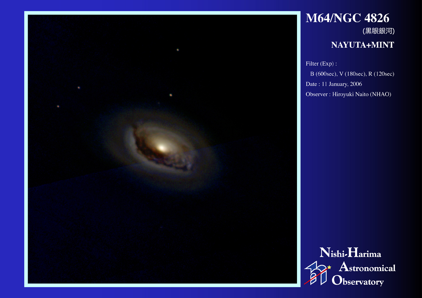 | M64 (Black Eye Galaxy) 1357px x 959px (518KB) 2970px x 2100px (1.9MB) Filter: B, V, R Exp. time: 900 sec. Date: Jan. 11, 2006 |