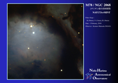 | M78(オリオン座の反射星雲) 低解像度 (470KB) 高解像度 (691KB) 赤:Rバンド 600秒 緑:Vバンド 900秒 青:Bバンド 1800秒 観測日:2010/ 2/ 3 天体個別ページへ |