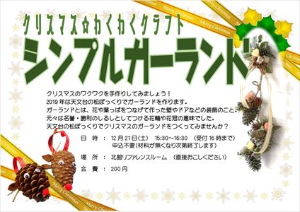 星の都のキャンドルナイト2019 キャンドルと星明かりのもと、ゆったりとした時間を過ごしてみませんか。 昼間の星と太陽の観察会、天文工作教室も通常通り開催します。 14:00〜14:30 3Dシアター Mitaka 上映 15:00〜15:30 3Dシアター Mitaka 上映 15:30~16:20 クリスマス☆わくわくクラフト「シンプルガーランド」 (200円、当日受付、材料が無くなりしだい終了)16:00〜 なゆた望遠鏡での天体観望の整理券配布 16:30〜18:00 天文講演会 「月の科学の最前線 〜月のうさぎと、月に吹く地球からの風〜」