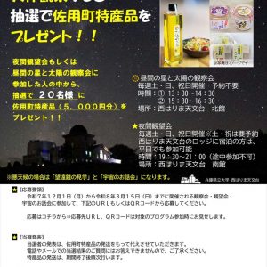 西はりま天文台のある兵庫県佐用町は合併20周年となります。 これを記念して、昼間の星と太陽の観察会または夜間観望会に参加した方を対象に、 佐用町特産品詰め合わせセットをプレゼントする企画が12月1日(月)から3月15 ...