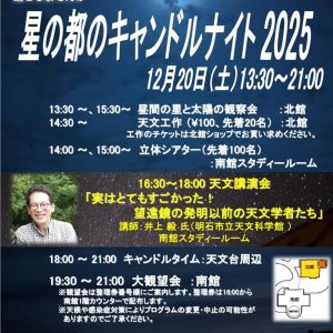 星の都のキャンドルナイト2025 星明かりとキャンドルの灯りを見ながら、 ゆったりとした時間を過ごしてみませんか。 日時: 12月20日(土) 13:30~21:00 詳しくはこちらもご覧ください プログラム: 13:3 […]