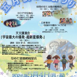 五月夜(さよ)の星まつり 2026年5月4日に毎年恒例の大観望会 (五月夜の星まつり)を開催します。 天文講演会(講師:国立天文台 冨永望 氏)と、 3DシアターMitakaの上映、「なゆた」での夜間観望会 (整理券が必 […]