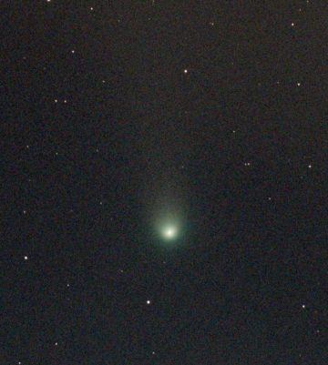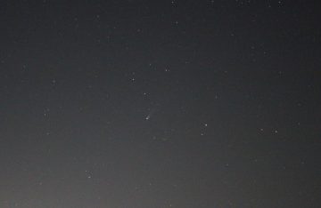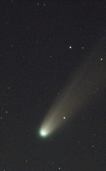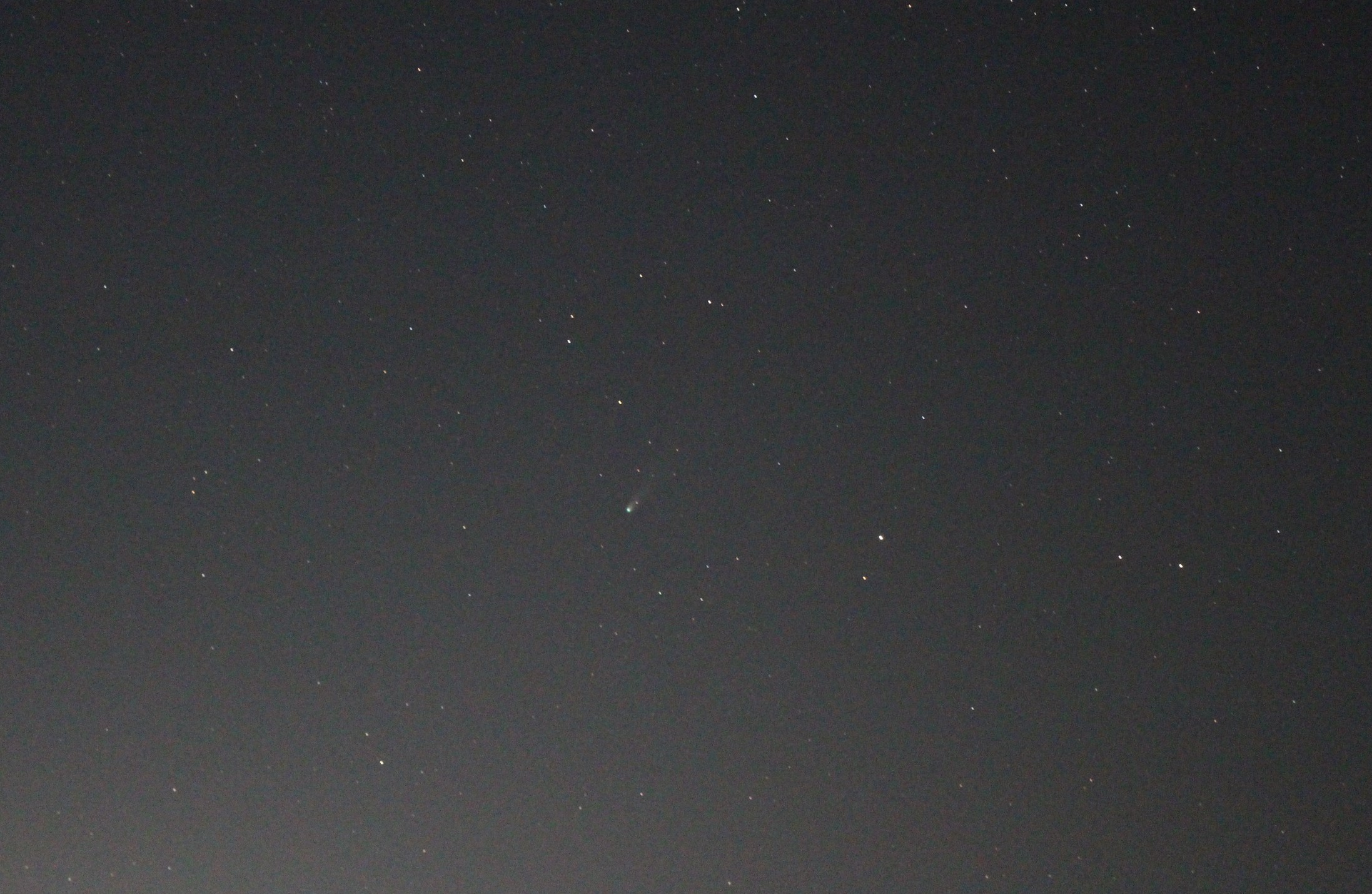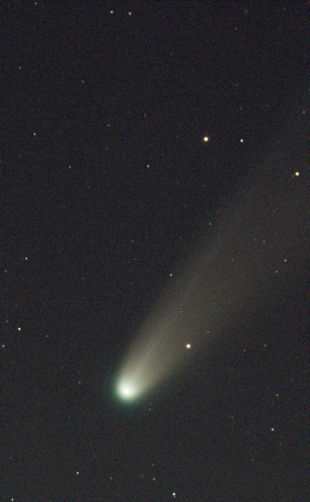 現在は夕方の西の空に見えており、肉眼での確認は難しいですが、双眼鏡を使うと淡い緑色の尾を確認できます。