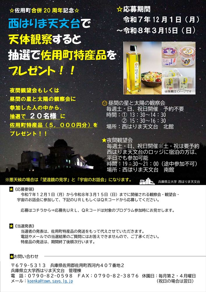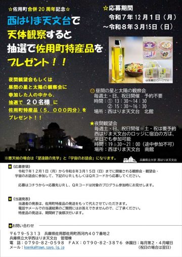 これを記念して、昼間の星と太陽の観察会または夜間観望会に参加した方を対象に、 佐用町特産品詰め合わせセットをプレゼントする企画が12月1日(月)から3月15日(日)まで行われます。