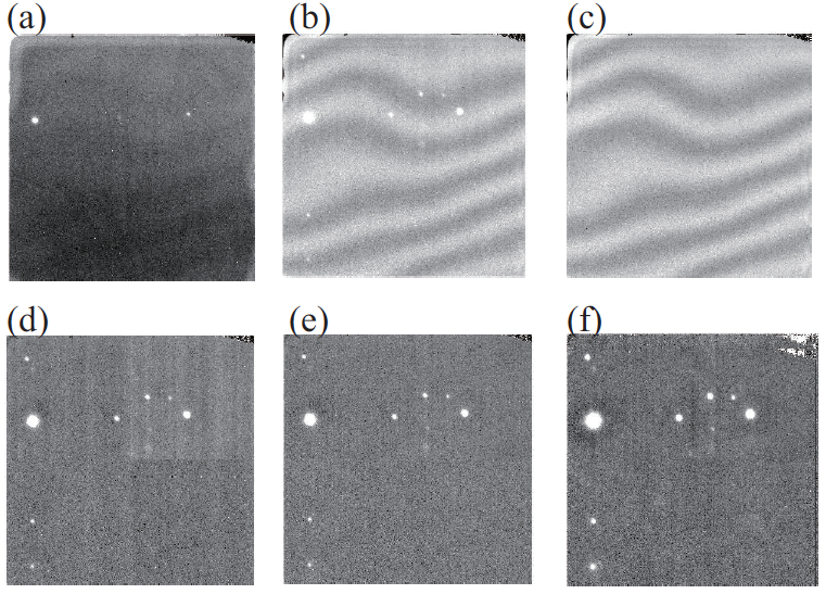 - The figure above shows the example image generated in each step. (a) Raw image, (b) The image after the step 4, (c) The sky frame generated in the step 5, (d) Sky-subtracted image after the step 6, (e) The 'stripe'-subtracted image after step 7, (f) The final image