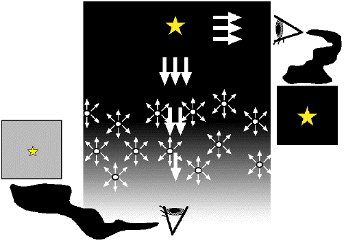 一方、地上の望遠鏡のように大気を通して星を見ると、皆さんが川底の魚や石をのぞきこむ時のように、星はゆらゆらとしてみえます。光は真空中から空気中に入射したり、空気中から水中に入射したりすると進行方向が曲げられます。これはレンズが光を曲げる理屈と同じですが、問題は地上の空気や水はレンズを作るために慎重に製造されたガラス材と異なり、自然の気まぐれによるムラムラがあることです。これによって天体からの光は、望遠鏡のレンズや鏡の表面に到達した時、その場所ごとに微妙に狂った角度変化を持って当たります。しかも川の中で水が流れているように、地上では空気が流れているため、その狂いの乱雑さは一時としてジッとしていません。このような光の波は、その波面がグチャグチャと乱されています。鏡の大きさが数10cmを超えるような望遠鏡をのぞくと、星像は図のように斑点が散らばったように見え、しかもそのパターンは時々刻々と変化していきます。どんなに精巧な望遠鏡を持ってしても長時間露光した星像は、直径数秒角(1秒角は1度の1/3600)の円盤になってしまいますが、その原因はこのためなのです。つまり大気を通して見たときに星の光を正確に1箇所に集めることは、口径10cm程度より大きい望遠鏡では無理ということになります。地上にある大型望遠鏡の多くは、みなピンボケなのです。