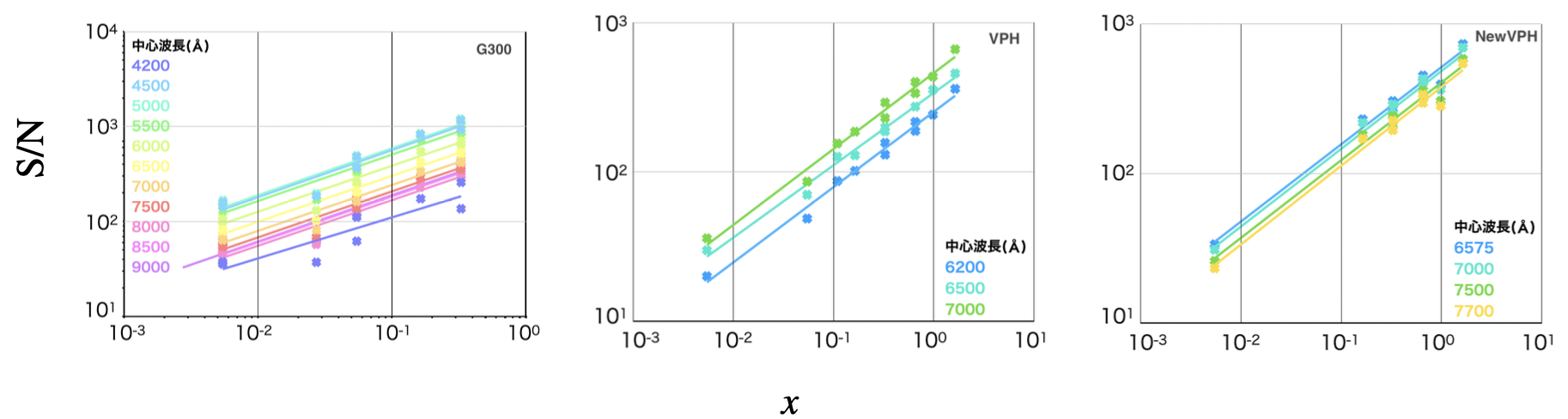 - 1次元化したスペクトルについて、各波長でのカウント平均値S (signal)を元にS/N=√S とした。