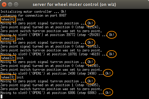 - wheelの初期化に失敗することがある。"server for wheel moter control" 窓(下図)のメッセージを見て、4つのwheel (番号: 0-3) の初期化が正常に完了したことを確認すること。