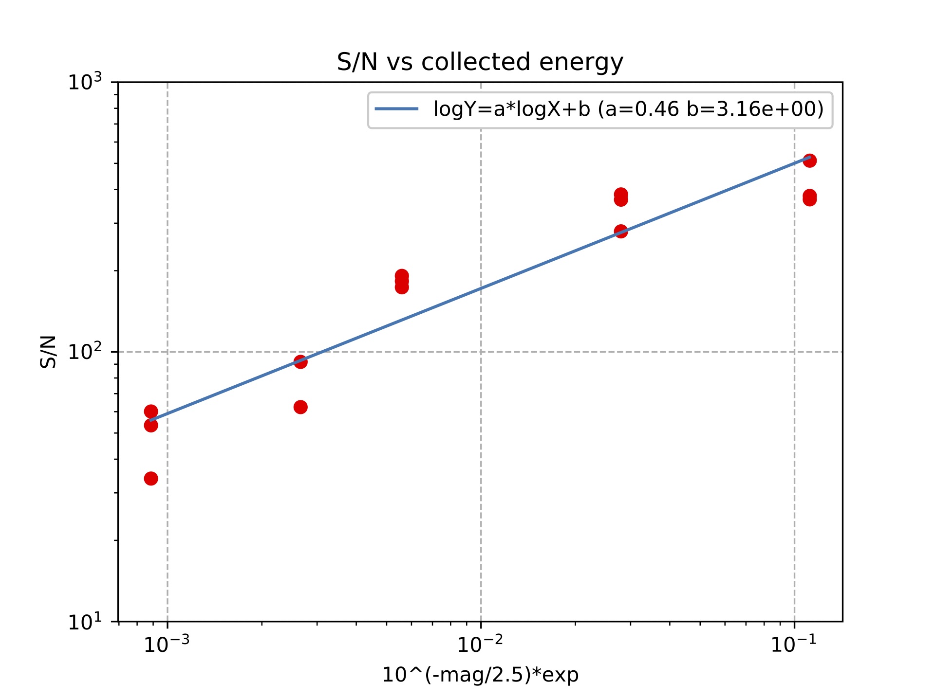 log(S/N) = a * log(X) + b (a=0.46, b=3.16)